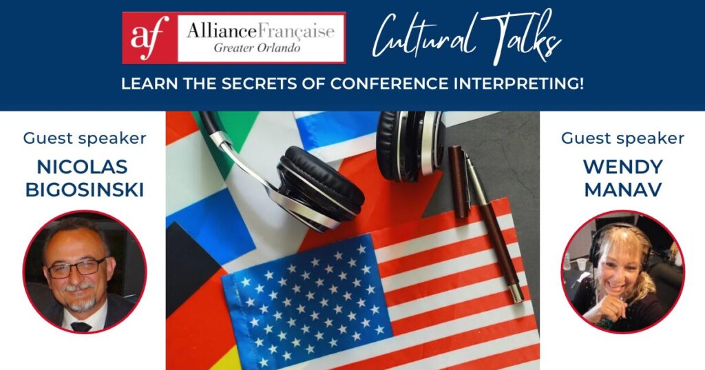 The Alliance Française of Greater Orlando is excited to continue its Monthly Cultural Talks series, offering a platform for engaging discussions with inspiring figures from the Francophone and multicultural world. Monthly Cultural Talks – November Edition The talk will be conducted in both French and English Learn the Secrets of Conference Interpreting We are delighted