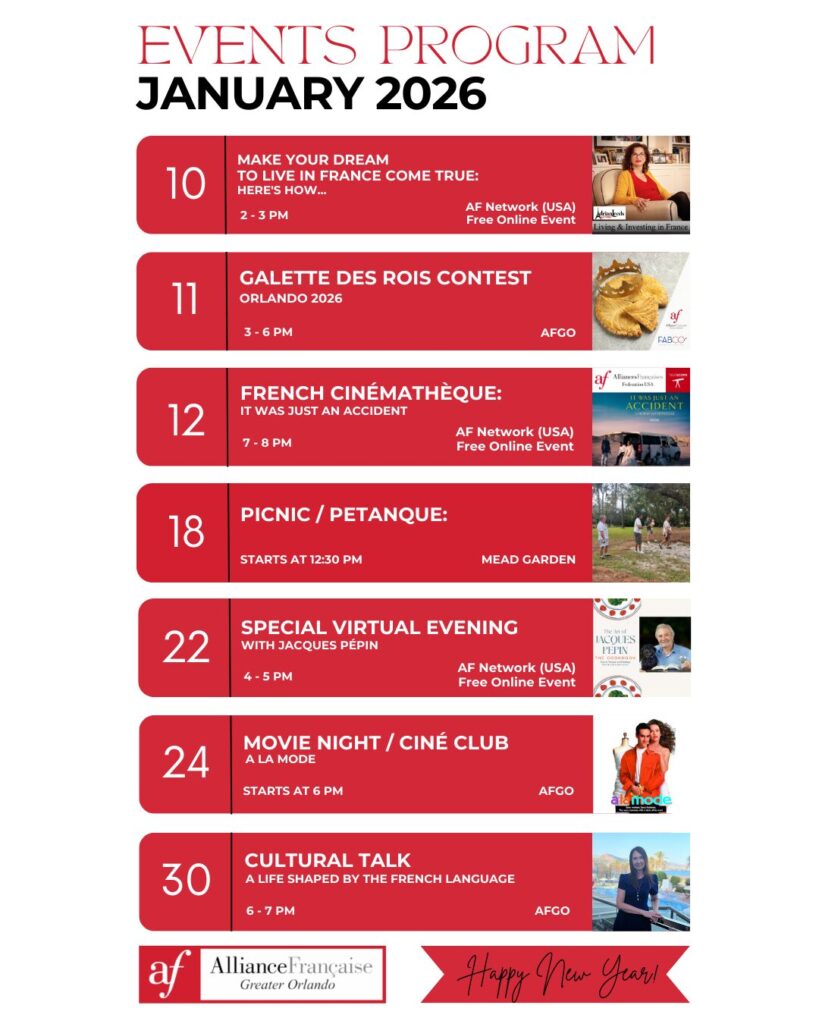 Looking for more ways to connect with French culture beyond Orlando? Enjoy these free online events open to Alliance Française members nationwide.