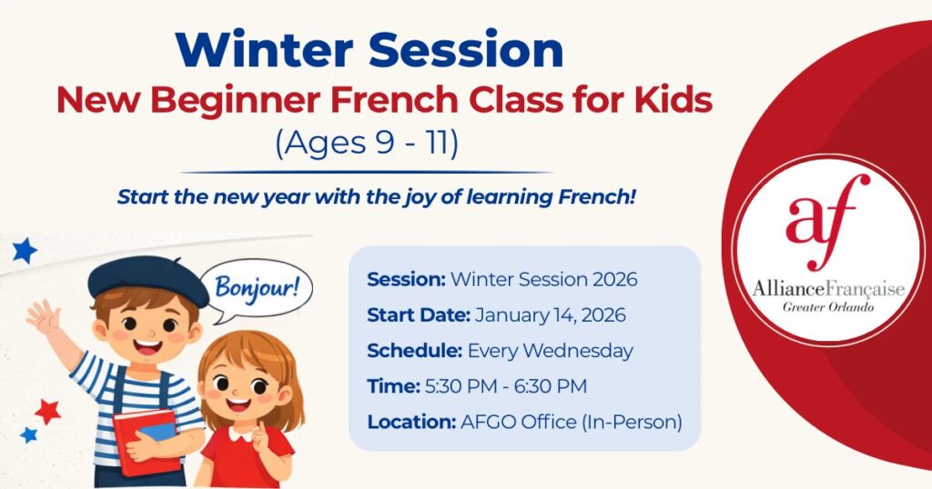Join our Winter Session French Beginner Group Class starting Tuesday, January 27th, from 6:00 to 8:00 PM at the Alliance Française of Greater Orlando.