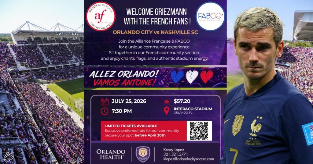 Get ready, Orlando! The Alliance Française of Greater Orlando and FABCO are teaming up for an unforgettable evening to welcome football superstar Antoine Griezmann to Orlando City! Join us on July 25, 2026 for a thrilling match and an electric atmosphere as we celebrate one of France’s most iconic players right here in Orlando. This […]